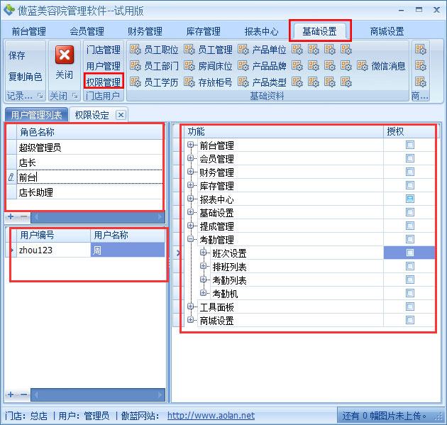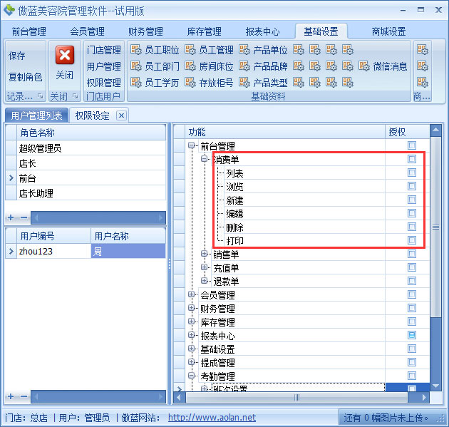 2、登錄軟件的用戶創(chuàng)建完成之后,在【基礎(chǔ)設(shè)置】→【權(quán)限管理】中根據(jù)角色,賦予該員工使用軟件的具體權(quán)限。左上角的角色名稱表示,該美容院使用傲藍美容院管理軟件的角色群體劃分;左下角的用戶編號,表示某個角色模塊包含哪些用戶,這些用戶就具有該角色的全部權(quán)限;右邊窗口表示不同功能模塊的權(quán)限管理。如圖: