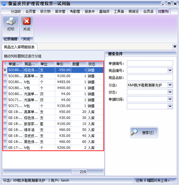 彈出商品出入庫明細報表就可以查看到商品狀態及明細還可以打印,此外,還可以根據商品的資料或出入庫的時間進行查詢,更精細化的監控好商品出入庫的情況,全面管理整個皮具護理店鋪。如圖: