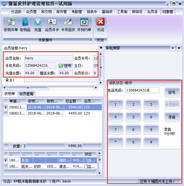 傲藍皮革保養店軟件電話預約操作,軟件支持接入來電寶,會員打電話到門店時,軟件會自動設別來電號碼,彈出會員的信息,無需再詢問來電客戶的信息再進行下一步工作,提高了工作效率。