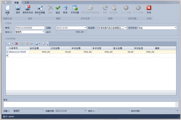 選擇供應(yīng)商,此該用戶所有需要付款的采購入庫單,費(fèi)用都會自動顯示到付款明細(xì)中,如下選擇“天津華獅汽車儀表有限公司 ”付款明細(xì)中會自動填充付款的一條記錄,如下圖所示: