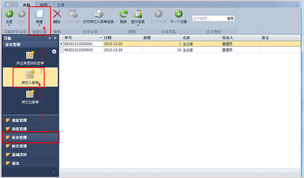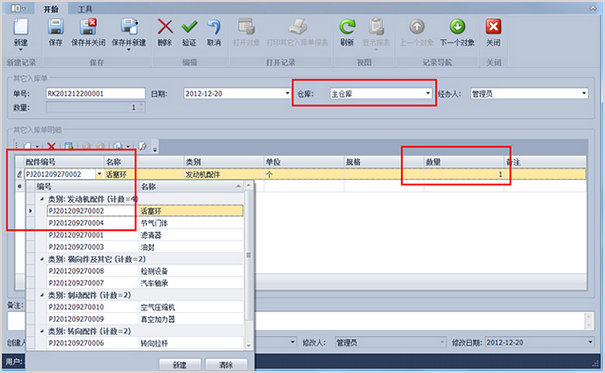 第2步、點(diǎn)擊工具欄的“新建”按鈕,彈出新建其它入庫(kù)單詳細(xì)界面。選擇入庫(kù)的倉(cāng)庫(kù),添加入庫(kù)明細(xì),即選擇入庫(kù)的配件編號(hào)和數(shù)量。