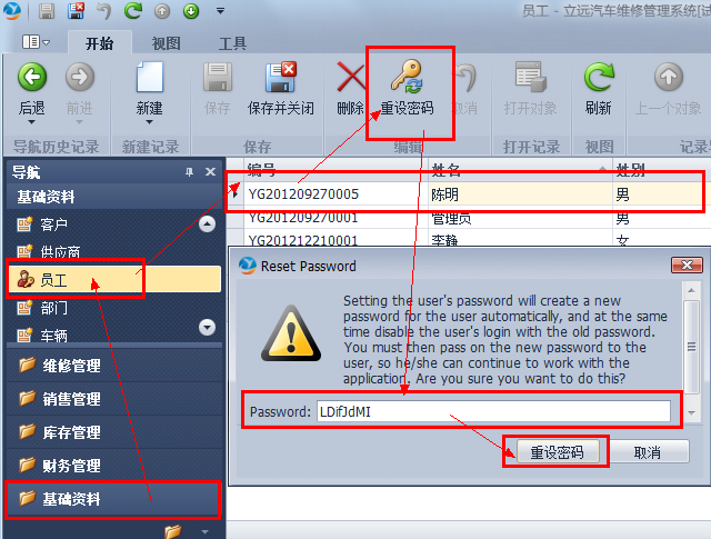 如何查看一個用戶的密碼呢?答案是無法查看,即使是管理員也無法查看。如果您屬下的某個員工忘記了密碼了,那么您可以用您的管理員賬號登陸系統,并且在“基礎資料”-“員工”中找到并選中該員工,點擊工具欄的“重設密碼”按鈕,在彈出的重設密碼窗口中輸入新的密碼即可,您也可以先為他設定簡單的密碼,然后讓他登陸后自行重設密碼。