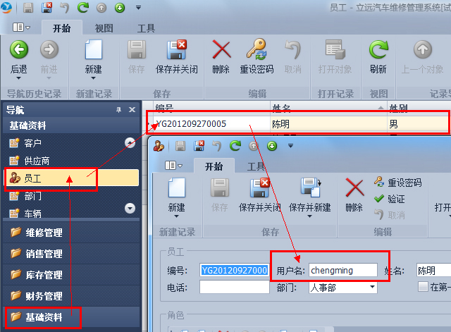 用戶名和密碼是登錄到傲藍汽車維修管理系統的兩把鑰匙,用戶名可以在“基礎資料”-“員工”,雙擊其中一個員工后,在“用戶名”字段中查看得到。
