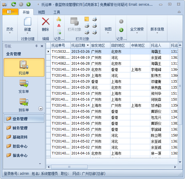 業(yè)務(wù)量比較大的時(shí)候,單成堆,找數(shù)據(jù)變得麻煩了,怎樣能夠快速找到我想要的單呢?通過傲藍(lán)物流管理軟件的篩選和全文搜索功能,你可以輕松辦到這一點(diǎn),例如一位叫“黃穎怡”的客戶打電話過來問“我想查一下我5月6號(hào)單號(hào)為TY201405160006的單到貨沒有?”,因?yàn)檫\(yùn)輸要幾天時(shí)間,而且網(wǎng)點(diǎn)這幾天也接到不少單,因此這個(gè)單子不容易從列表中看出來。