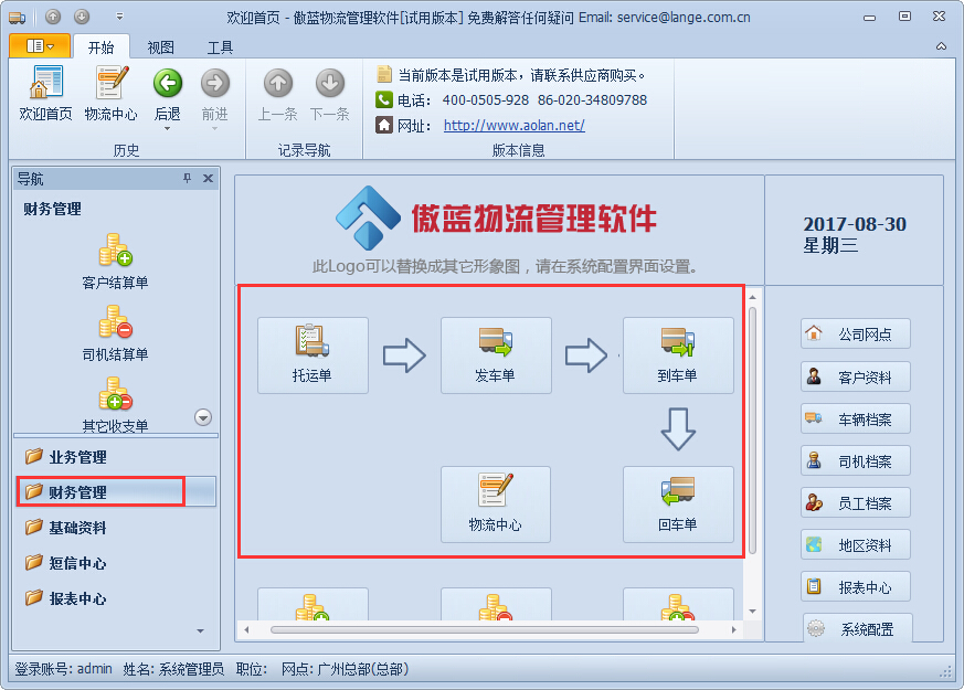 傲藍物流管理系統既是物流全流程管理軟件,也是公司的財務管理軟件,  流程完備,依據物流邏輯設置了嚴謹的運作流程,審核流程;收入管理,專門設置了財務管理流程,不會遺漏每一分錢。 運輸管理系統和財務系統深度契合,所有財務數據都來自于運輸體系,每一個數據都可以追溯到運作源頭。每一筆支出都是可以查看到具體人員,合同,業務關系,驛虎將財務系統和運輸系統緊密結合在一起,功能更強大。