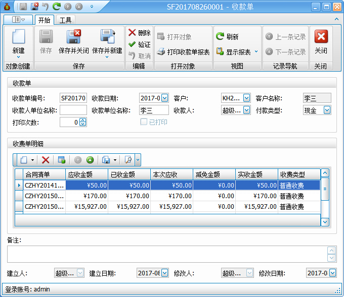 舞臺租賃軟件結(jié)算管理-收款單的具體屬性包括:編號、收款日期、客戶、收款人單位名稱、付款人單位名稱、收款人、付款類型、備注、收費(fèi)單明細(xì)等屬性。