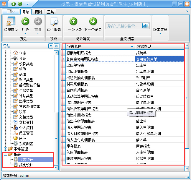 傲藍舞臺租賃軟件應(yīng)用-報表中心的介紹,豐富報表滿足多種舞臺設(shè)備租賃用途的查詢、打印、統(tǒng)計以及圖表反應(yīng)數(shù)據(jù)。具體報表包括:報價單報表、出租丟損單報表、出租丟損明細報表、出租合約報表、出租合約報表(按客戶)、出租回收單報表、出租設(shè)備清單、付款單報表、付款明細報表、活動出庫單報表、活動暫支結(jié)算單報表、結(jié)算單報表、庫存報表、收費單報表、收費明細報表、應(yīng)付報表、應(yīng)收報表。