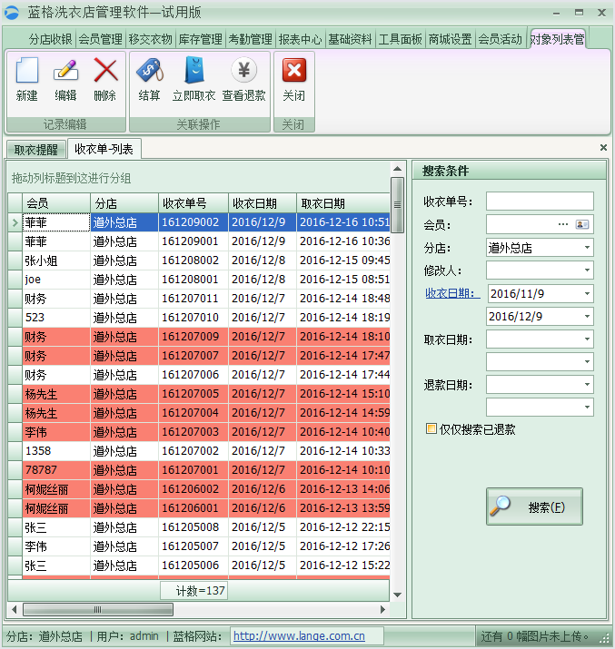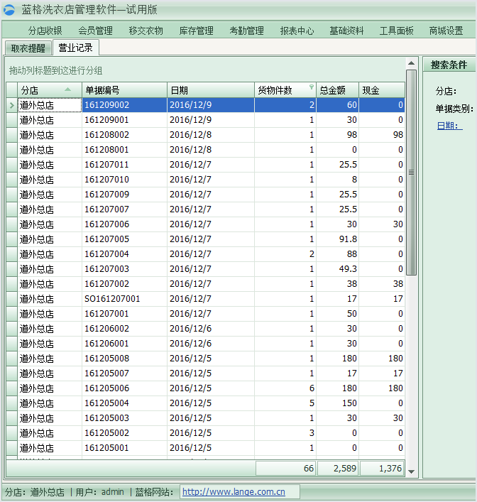 干洗店連鎖管理軟件在【報表中心】【營業記錄】表中可以根據分店搜索每個分店的單據付款信息。