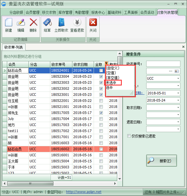 下面介紹在傲藍洗衣店干洗系統中,如何篩選今天會員需要領取衣物的操作: