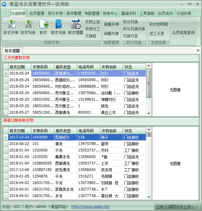 點擊傲藍洗衣店管理軟件的“門店收銀”導航菜單的“取貨提醒”,打開提醒界面中上面是三天內要取衣物列表,下面是顧客過期未取衣列表。如下圖: