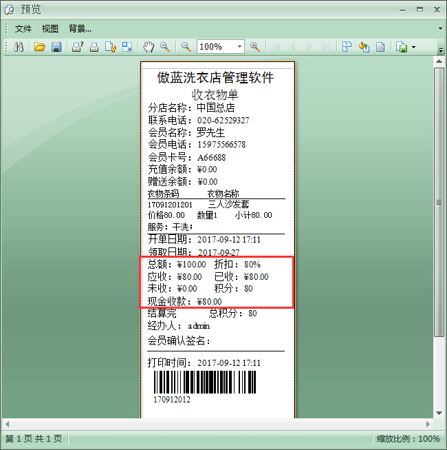 3、在洗衣軟件中完成收衣開單進行收款之后,軟件支持打印收衣單,在收衣單上還可以直接展示打折前的收衣價格、享受折扣、折后應收的金額;讓會員清晰看到自己享受到的折扣優惠,吸引會員再次消費。如圖: