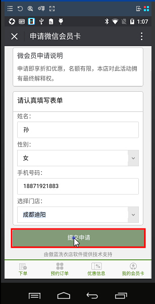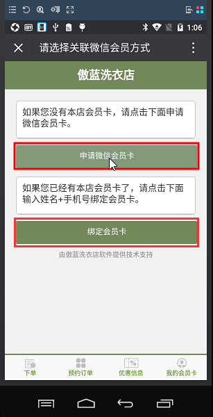 ②若該會員已經是本店的會員卡點擊“綁定微信會員卡”,會員信息將自動綁定到微信中;若微信用戶還不是洗衣店的會員則點擊“申請微信會員卡”,填寫基礎會員資料,提交申請,即可申請門店的會員卡保存的微信中,會員資料同步上傳到門店的傲藍洗衣軟件中。如圖: