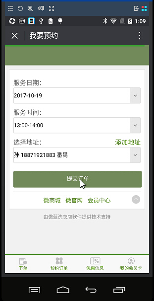 2、會員微信服務預約,點擊微型公眾號中的“我要預約”,選擇需要預約的服務類型;填寫好預約日期及時間點,以及預約地址,添加預約訂單,如圖:
