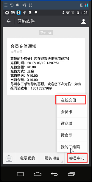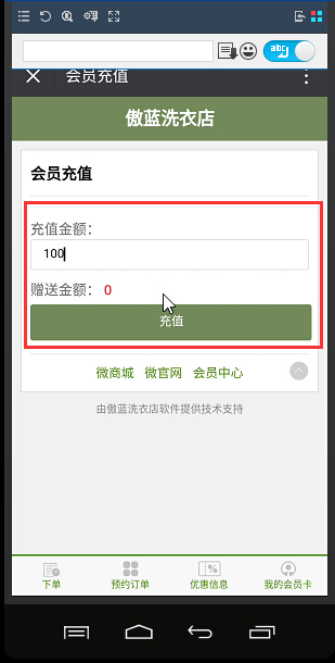 3、傲藍洗衣軟件微信公眾號支持會員充值,微信會員可以隨時在微信公眾號查看自己卡內余額,發現余額不足時可以在公眾號上自助充值,方便快捷,點擊【會員中心】→【在線充值】,填寫好充值金額后按提示進行支付即可完成會員自助在線充值,如圖: