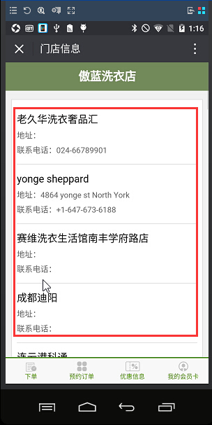 5、傲藍洗衣軟件微信公眾號洗衣店信息展示,方便會員在外出差或旅行的會員選擇近的自己認準的老牌洗衣店進行洗衣服務;點擊【會員中心】→【會員卡】→【門店信息】可查看該洗衣店的連鎖門店地址、電話信息,如圖: