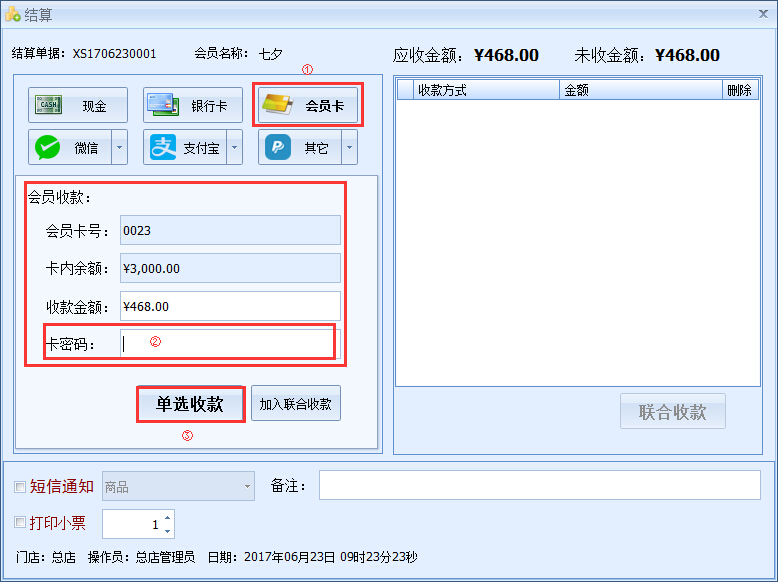 ②會員卡收款,若會員的會員卡上充值余額,銷售收款時軟件會自動選擇會員卡收款,一般會員卡上會設置付款密碼,輸入密碼點擊收款即可,如圖: