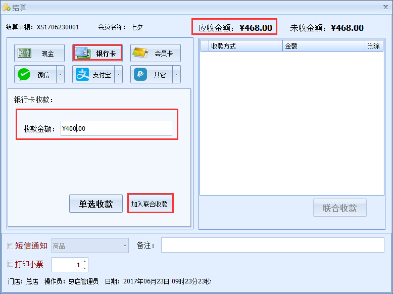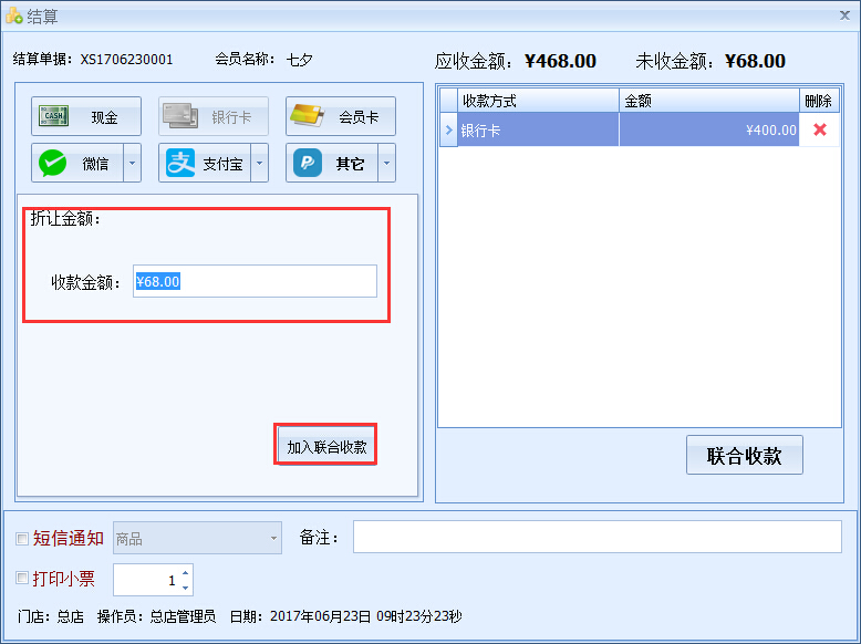 ④門店優(yōu)惠活動減免金額后收款,首先選擇會員實際付款方式,輸入實際支付金額,然后點擊“加入聯(lián)合收款”如圖: