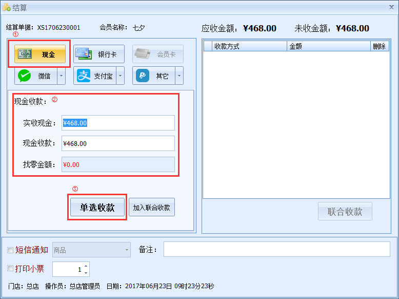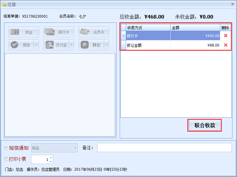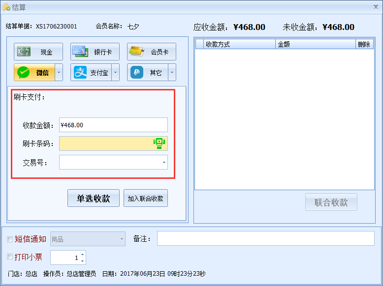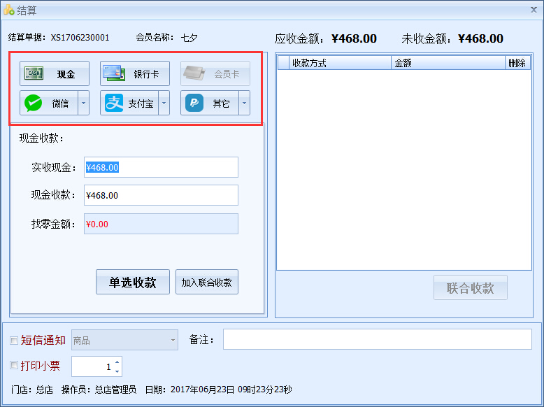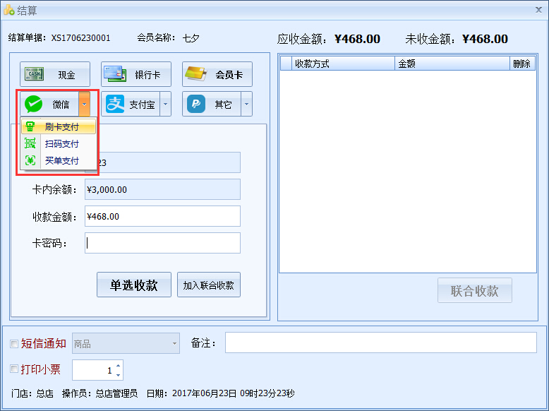 2、在銷售單點擊收款后,進入收款界面,軟件支持現(xiàn)金、銀行卡、會員卡、微信支付、支付寶支付等方式進行收款,如圖: