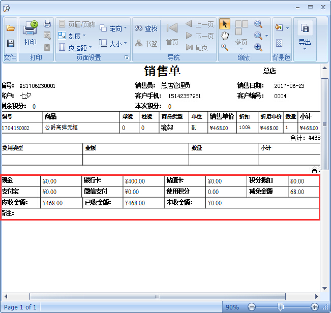 ⑤收款完成之后,軟件自動答應單據(jù),并且在單據(jù)上顯示本次收款的具體收款方式及金額,如圖: