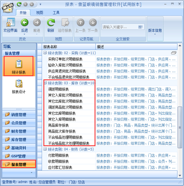 如:調(diào)撥明細(xì)報(bào)表、其他入庫(kù)批次明細(xì)報(bào)表、其他出庫(kù)批次明細(xì)報(bào)表、調(diào)撥商品批次明細(xì)報(bào)表、其他出庫(kù)明細(xì)報(bào)表、其他入庫(kù)明細(xì)報(bào)表、商品庫(kù)存報(bào)表、商品批次庫(kù)存報(bào)表、不合格品處理明細(xì)報(bào)表、不合格品批次處理明細(xì)報(bào)表,這豐富的統(tǒng)計(jì)、明細(xì)報(bào)表記錄了整個(gè)眼鏡門(mén)店內(nèi)的庫(kù)存情況,協(xié)助眼鏡店更加精準(zhǔn)、清晰的管理好商品庫(kù)存。