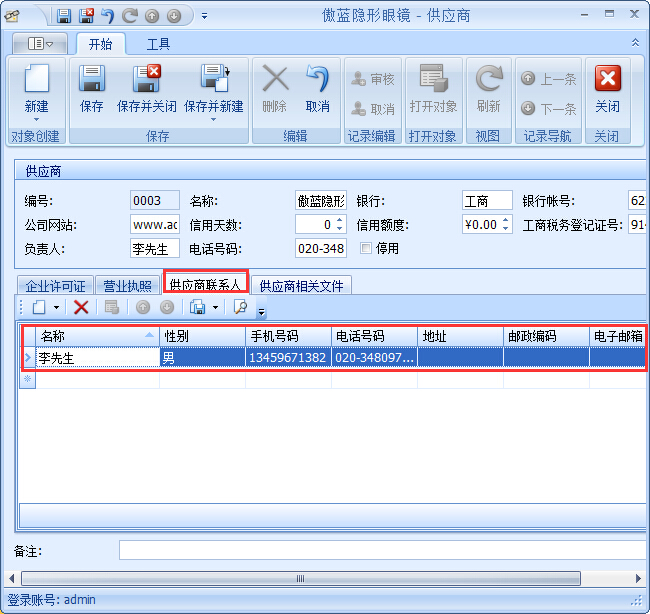 ④供應商聯系人也必須要登記,系統支持等級多個供應商聯系人,方便眼鏡門店聯系供應商,如圖: