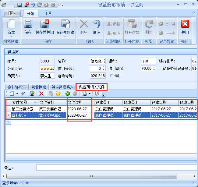 ⑤除了需要詳細等級供應商的各種信息,還需要在供應商相關文件中,上傳供應的許可證與營業執照副本文件,按照規定,隱形眼鏡不能在供應商證件過期之后進行采購,這時系統支持記錄供應商的證件過期時間,在供應商證件過期的時候,系統會自動給出提醒,所以需要在軟件上設置文件過期日期,填寫完畢,保存即可。如圖: