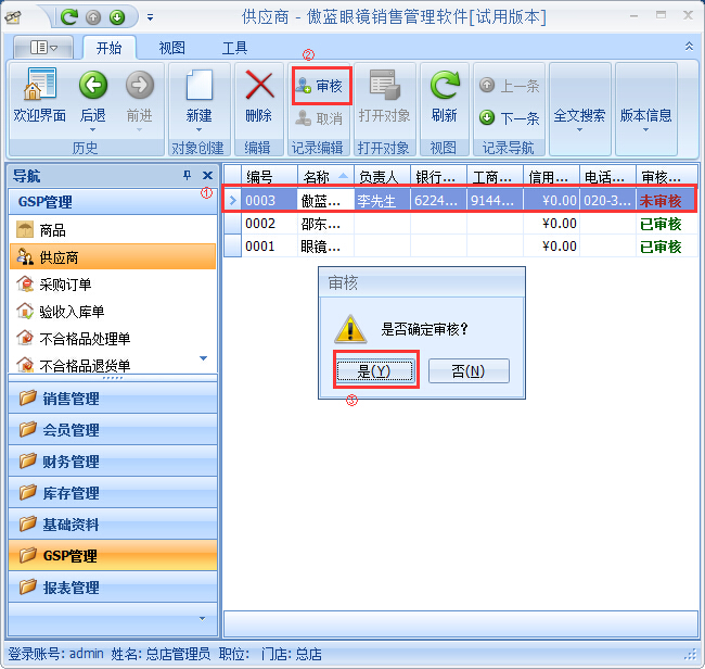 4、供應商建立完成之后,還需要審核,審核之后才能從該供應商處采購隱形眼鏡,在傲藍隱形眼鏡管理系統供應商管理界面,選擇需要審核的供應,點擊“審核”確定,即可完成對該供應商進行審核,如圖: