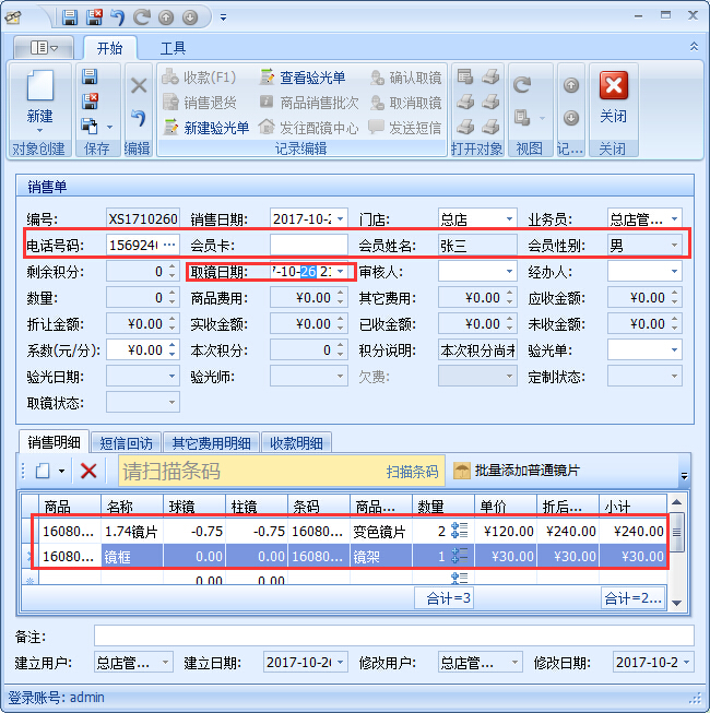 1、在軟件給客戶開銷售單,點擊【銷售管理】→【銷售單】→新建銷售單,選擇會員,并確認會員購買的商品,設置好取鏡日期,保存銷售單,如圖: