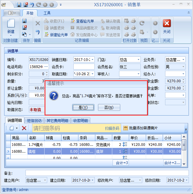 ①保存之后會提示鏡片商品庫存不足,點擊“是”繼續操作即可,因為鏡片需要在工廠加工,鏡片庫存在配鏡工廠,如圖:
