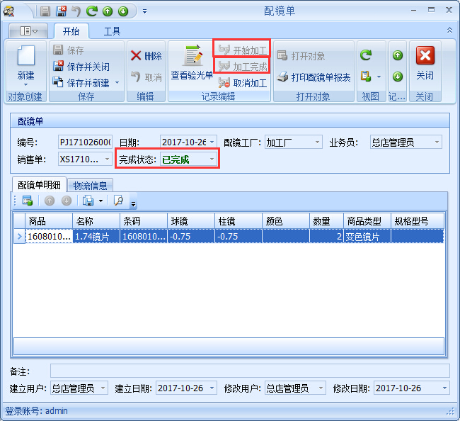 ①雙擊待處理的配鏡單打開配鏡單,可以查看配鏡單明細,開始加工鏡片時點擊菜單欄的“開始定制”,當加工完成之后在配鏡單中點擊“完成定制”,定制的轉態就會實時反應到門店軟件中,讓門店的工作人員實時查看配鏡進度,如圖: