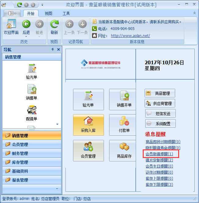 3、當配鏡中心眼鏡定制完成,門店的傲藍眼鏡專賣店管理軟件實時接收配鏡進度,完成配鏡后軟件自動做出取鏡提醒,如圖:
